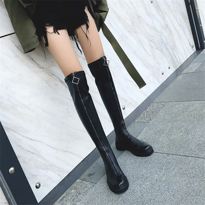 HOT SALE NAYIDUYUN Thigh High Boots Women Black Leather Over The Knee Booties Med Heel Tall Shaft Punk Sneak